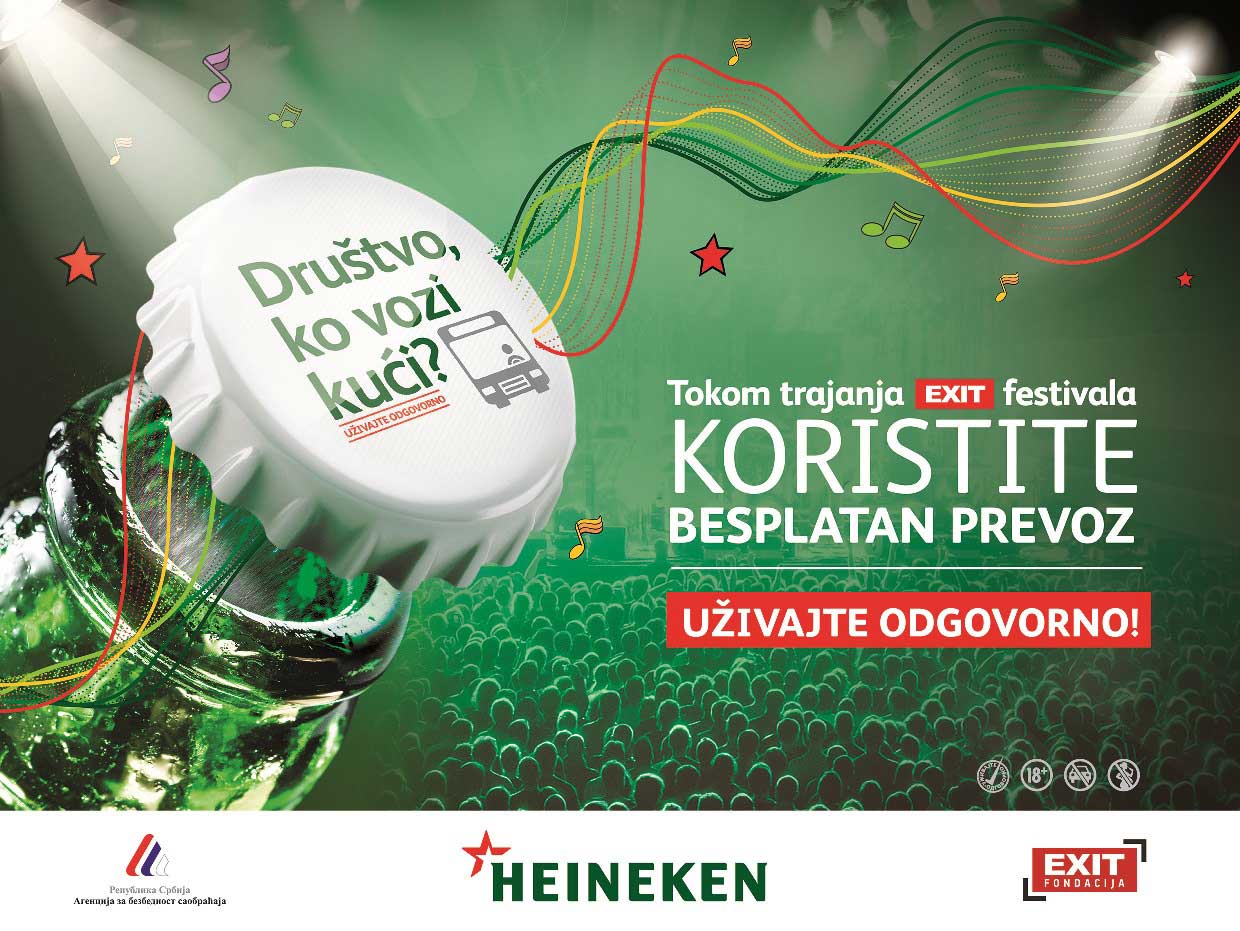 Od otvaranja kapija Petrovaradinske tvrđave u četvrtak, pa do poslednjeg after partija u ponedeljak, kompanija HEINEKEN Srbija je kroz svoju tradicionalnu kampanju „Društvo, ko vozi kući?" obezbedila siguran i besplatan taksi prevoz za posetioce EXIT festivala. Akcija se sprovodi u saradnji sa Agencijom za bezbednost saobraćaja i EXIT fondacijom sa ciljem povećanja bezbednosti posetilaca popularnog festivala u Novom Sadu.